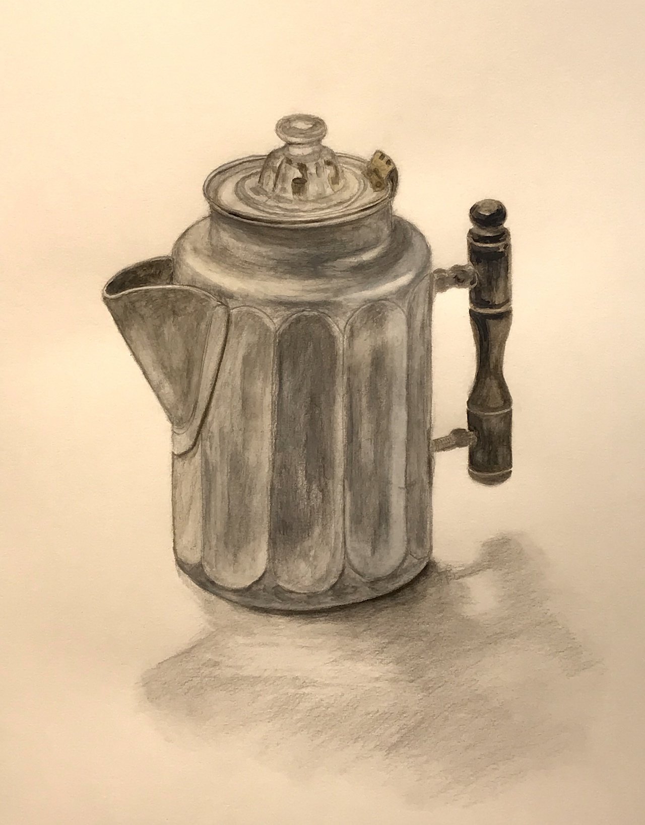 そして、こちらの生徒さんは水彩画でアルミのポットを描きました。