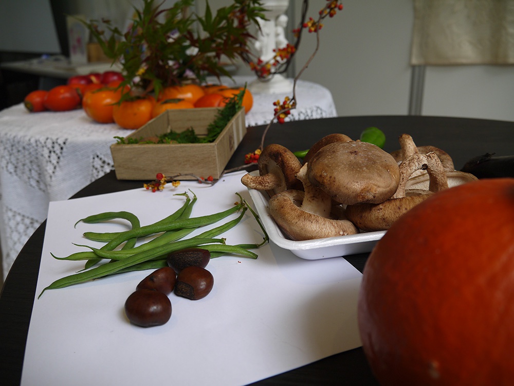 会場には、かぼちゃ、ナス、椎茸、カキ等々の秋野菜がずらり...