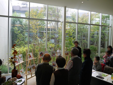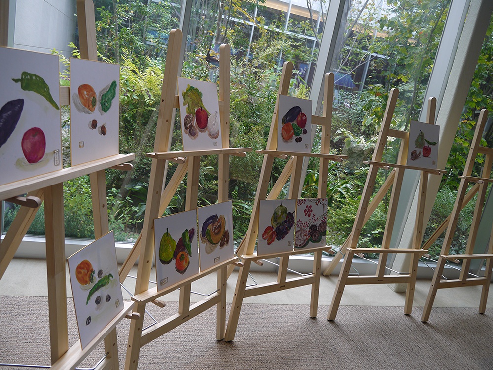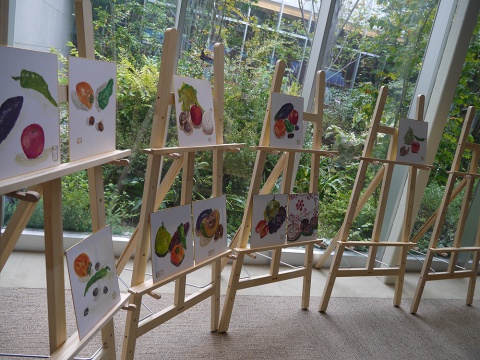 午前11時からは、赤・青・黄の三原色だけを使って秋野菜を描くワークショップ。