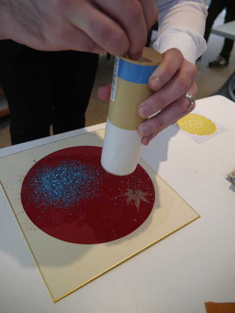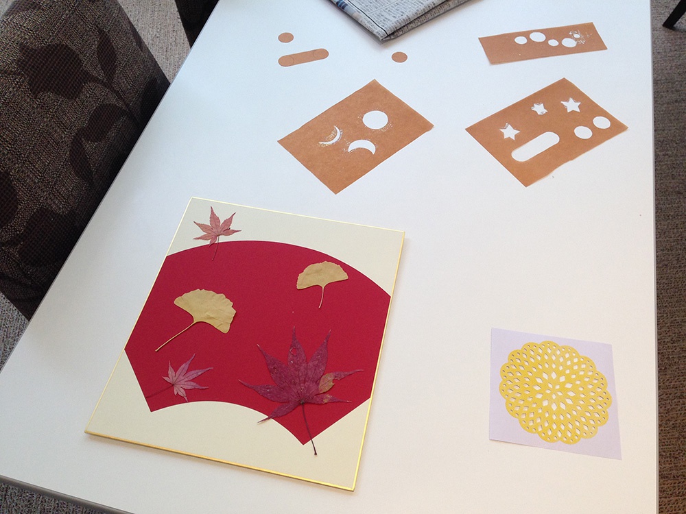 今回は、金や銀箔などの箔、落ち葉を使って色紙を彩りました。