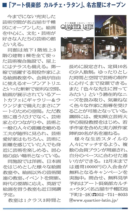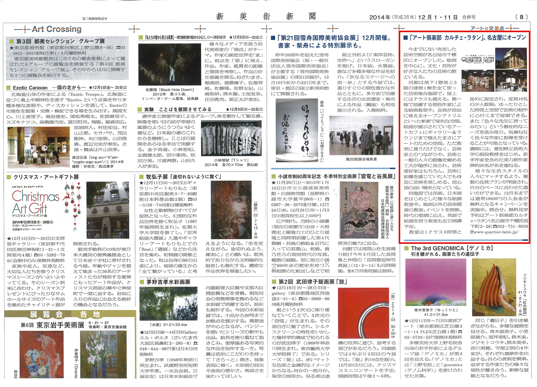 新美術新聞 2014年12月1・11日 合併号に「アート倶楽部 カルチェ・ラタン」、名古屋にオープン と、大きく取り上げていただきました!