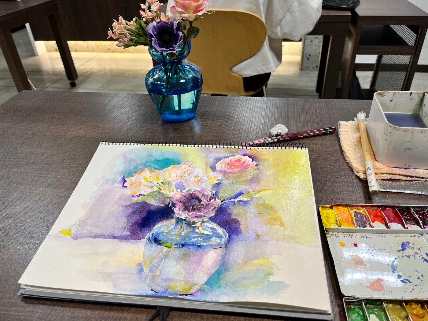 水彩の『にじみ』を利用して描かれました!アネモネやバラが背景から浮かび上がるように描けました!