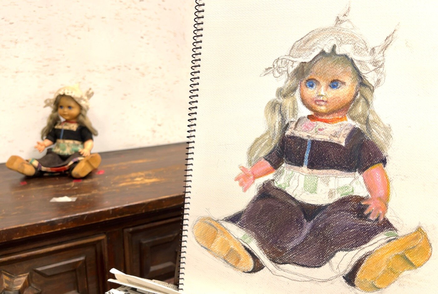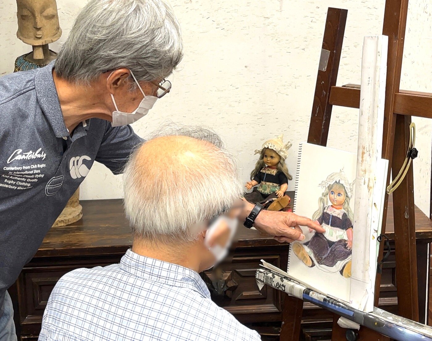 写真上・人形をモチーフにされた生徒さんの制作途中の作品です。