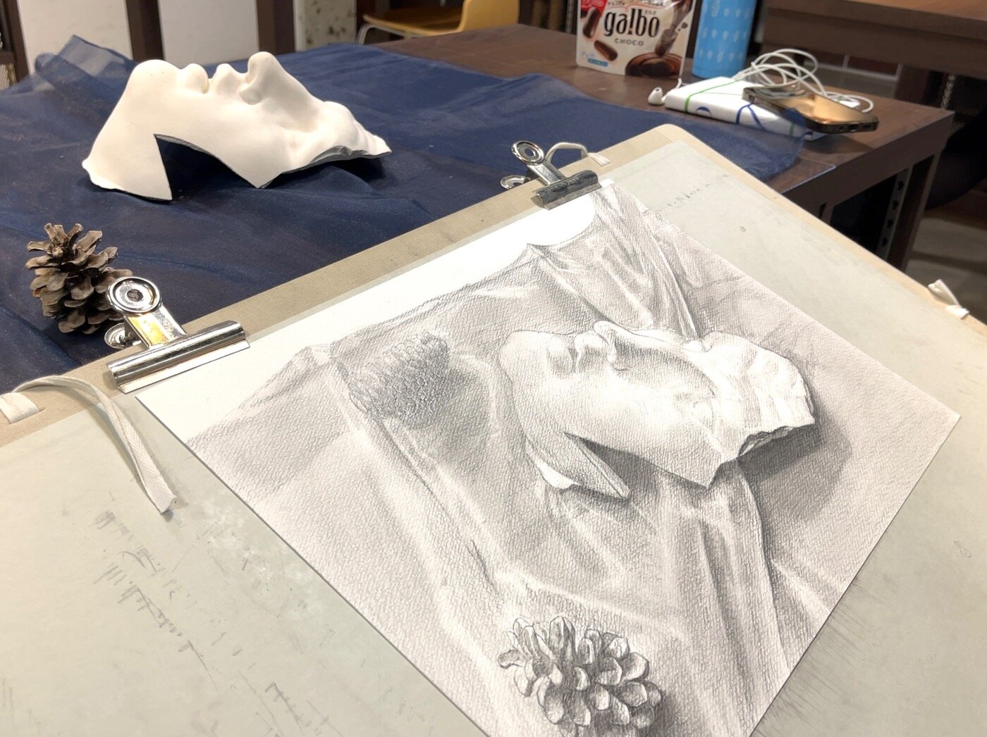 写真上・生徒さんのデッサンです。石膏像の顔(ボルゲーゼの闘志)と松ぼっくりを描いています。