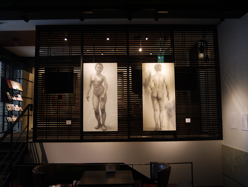 お二人が同時に一人のモデルを素描で書き上げたデッサンの大作も展示しております。