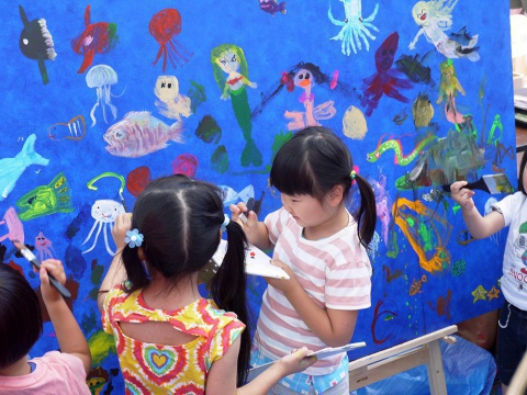 大きな真っ青な150号のキャンバスに、好きな海の生き物を描き、大きな一つの作品づくりにみんなで取り組みました。