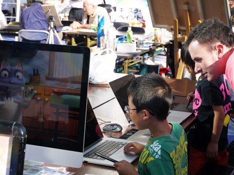 普段はなかなか目にすることのない大きなキャンバスに、次々と子供たちの好きな生き物たちが描かれていきます。