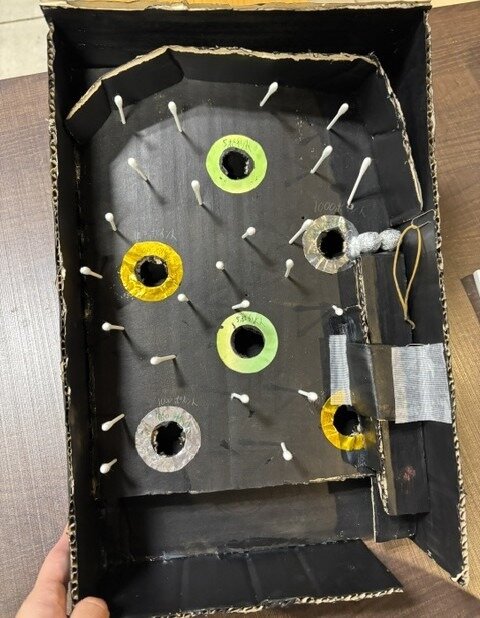 釘は綿棒で代用、パチンコ玉はアルミホイルで作りました。