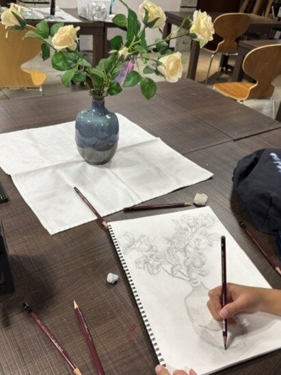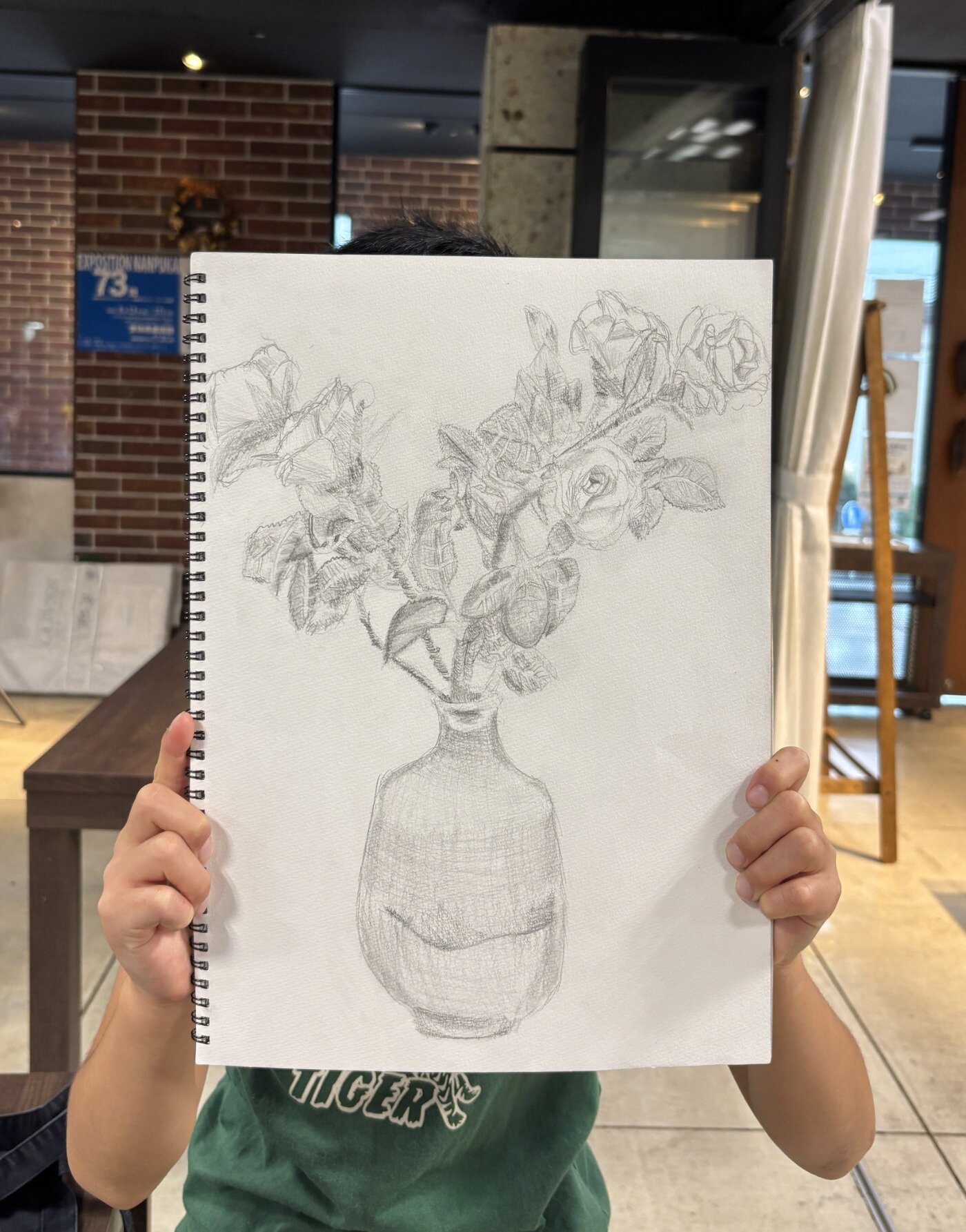 ローズのデッサンをしました。自分で瓶に行けるお花を選びましたよ。