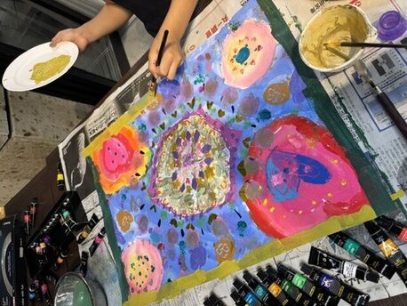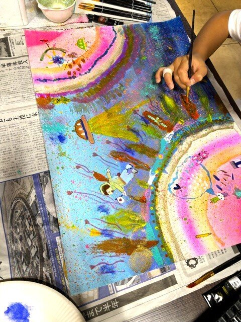 絵具だけでなく色紙を切って貼りコラージュを加えたりしたことでより素敵な作品になりましたね。