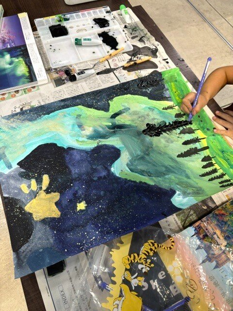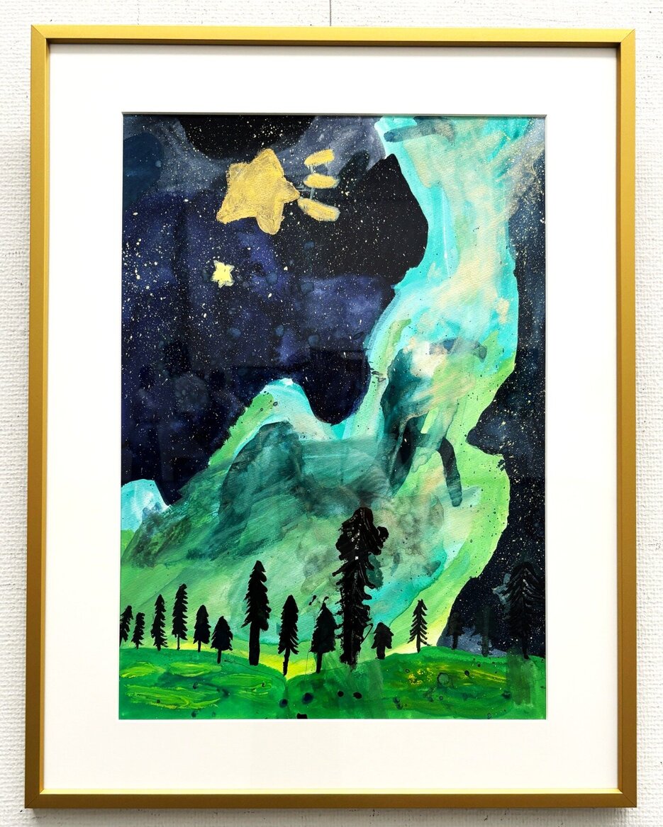 のびのびと描いたオーロラがとってもきれいですね、夜空にある満点星はスパッタリングという技法を使い描きました。