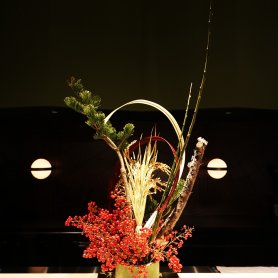 小川珊鶴先生から二年続けて頂戴しました。いつも素晴らしい設えとご指導をありがとうございます。2016年最後のお花教室で先生が生けられた「お正月花」はこちら。