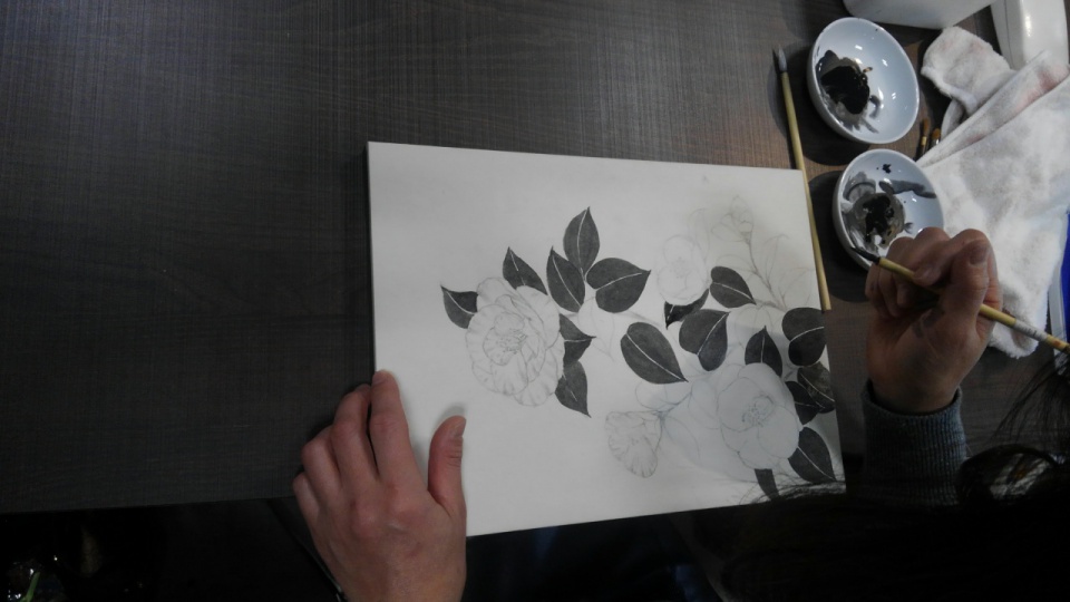紙に直接鉛筆でデッサンをして、墨でコントラストをつけます。