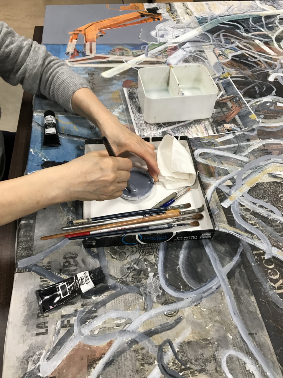 今回は、画面の上に見えるグレーの色面をもう少し広げようと、新たに混色して色を作られています。