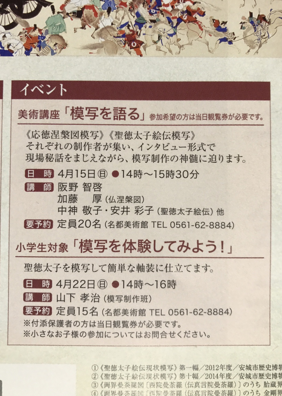 只今、名都美術館で開催中の『愛知県立芸術大学模写完成記念展 応徳涅槃図と聖徳太子絵伝』にてイベントを行います。