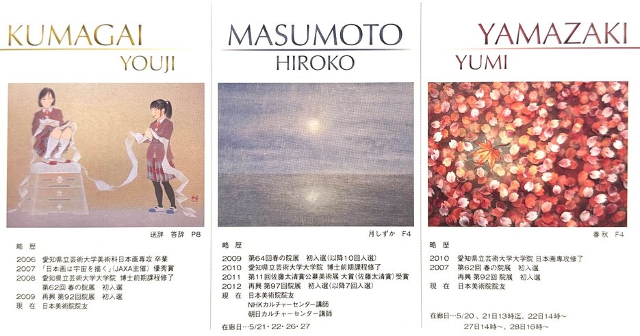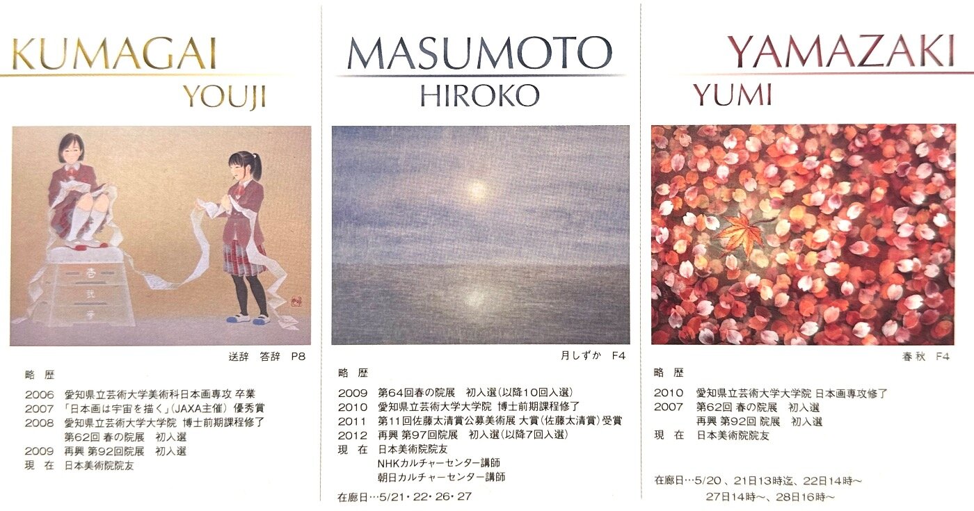 日本画三人展「つなぐ」が名古屋市昭和区アートサロン光玄で5月20日(土)〜28(日)まで開催されます。