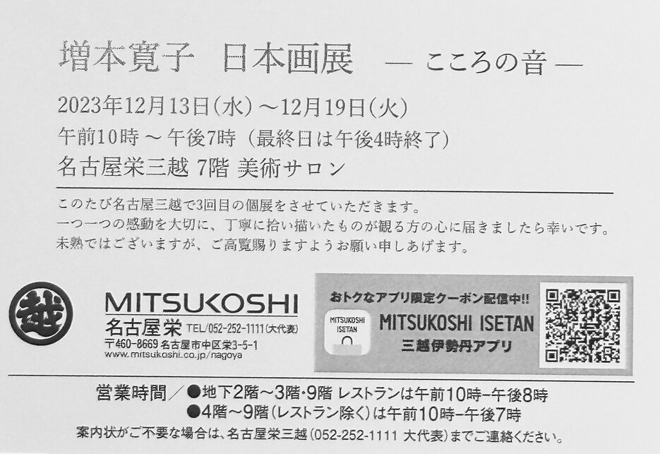 木曜日の日本画教室を担当されている増本寛子先生の個展のご案内です。