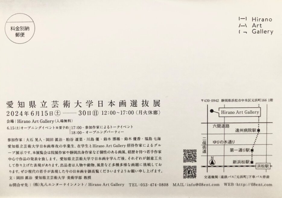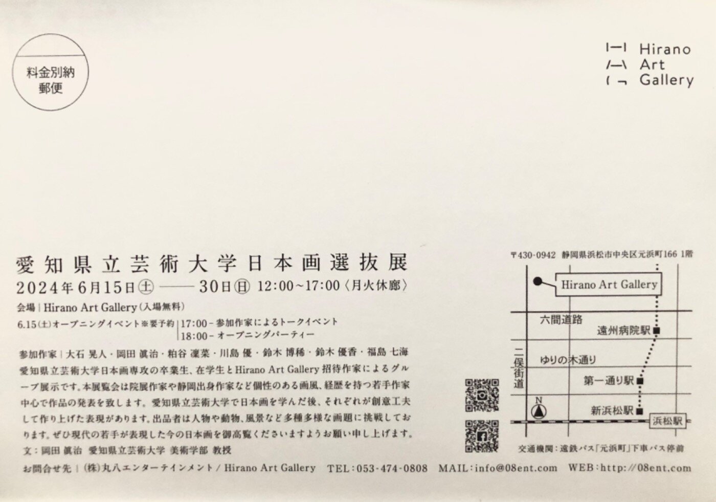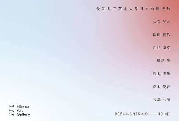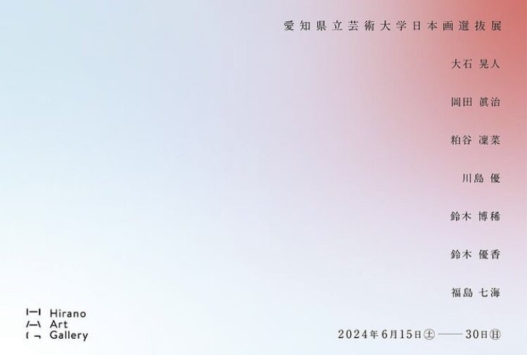 愛知県立芸術大学日本画専攻の卒業生、在学生とHirano Art Gallery 招待作家によるグループ展示です。本展覧会は院展作家や静岡出身作家など個性のある画風、経歴を持つ若手作家中心で作品の発表を致します。愛知県立芸術大学で日本画を学んだ後、それぞれが創意工夫