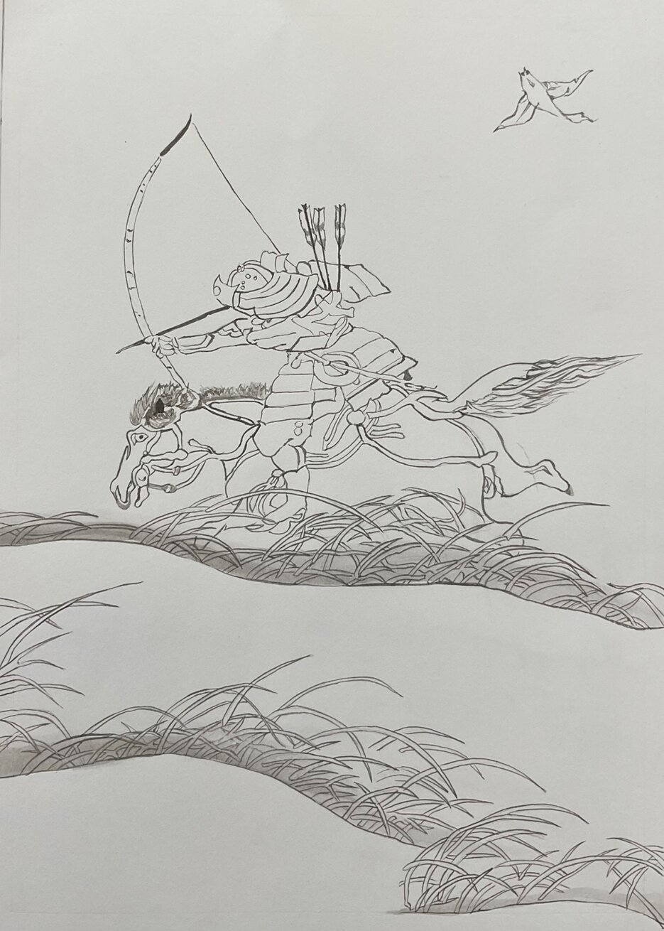 「日本画画材で合戦図絵巻のぬり絵をしよう!」ということで、合戦図絵巻から線画を在学生2人で描き起こし、準備しました。