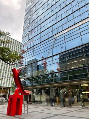 中区役所は中日ビルの隣、赤色のモニュメントが目印です。
