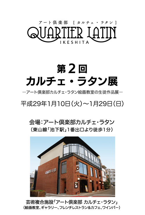 アート倶楽部カルチェ・ラタン絵画教室 生徒さんの作品展「第2回カルチェ・ラタン展」を1月10日(火)から29日(日)まで開催いたします。