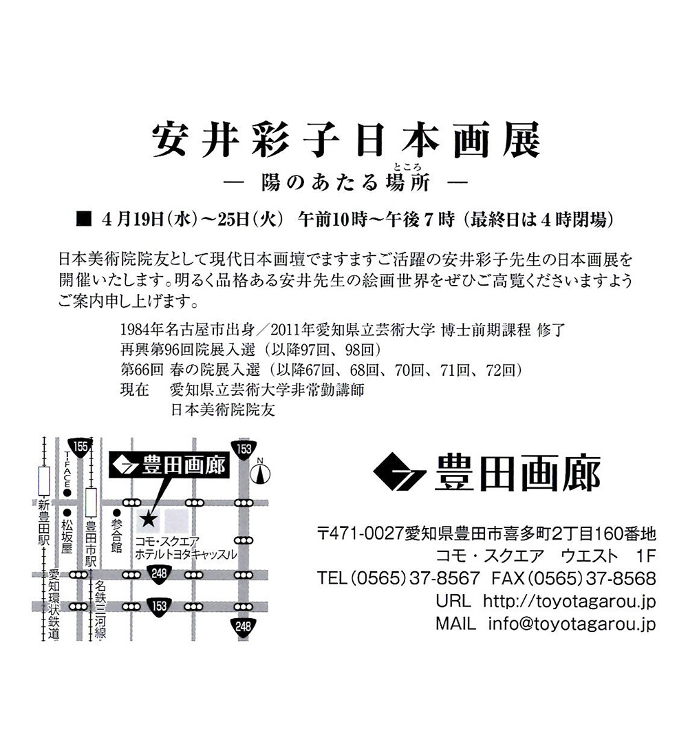 アート倶楽部カルチェ・ラタンで日本画の講師を務めていただいている安井彩子先生の個展が4月19日より豊田画廊にて開催されます。