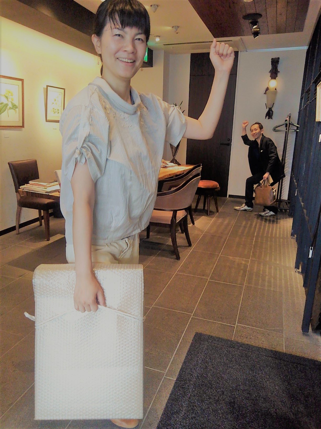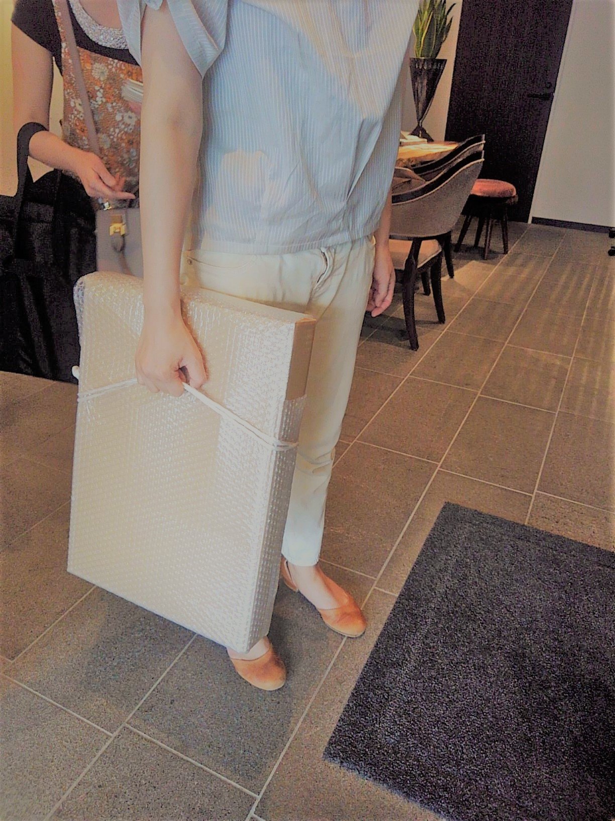 「こうすると、体にぴったりくっつき片手でも持ちやすくなります。片手に作品、もう一方の手に荷物を持てるので・・・」