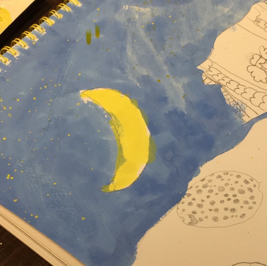 筆につけた黄色の絵の具を高い位置からトントン叩いて落とし、星空を表現しました。