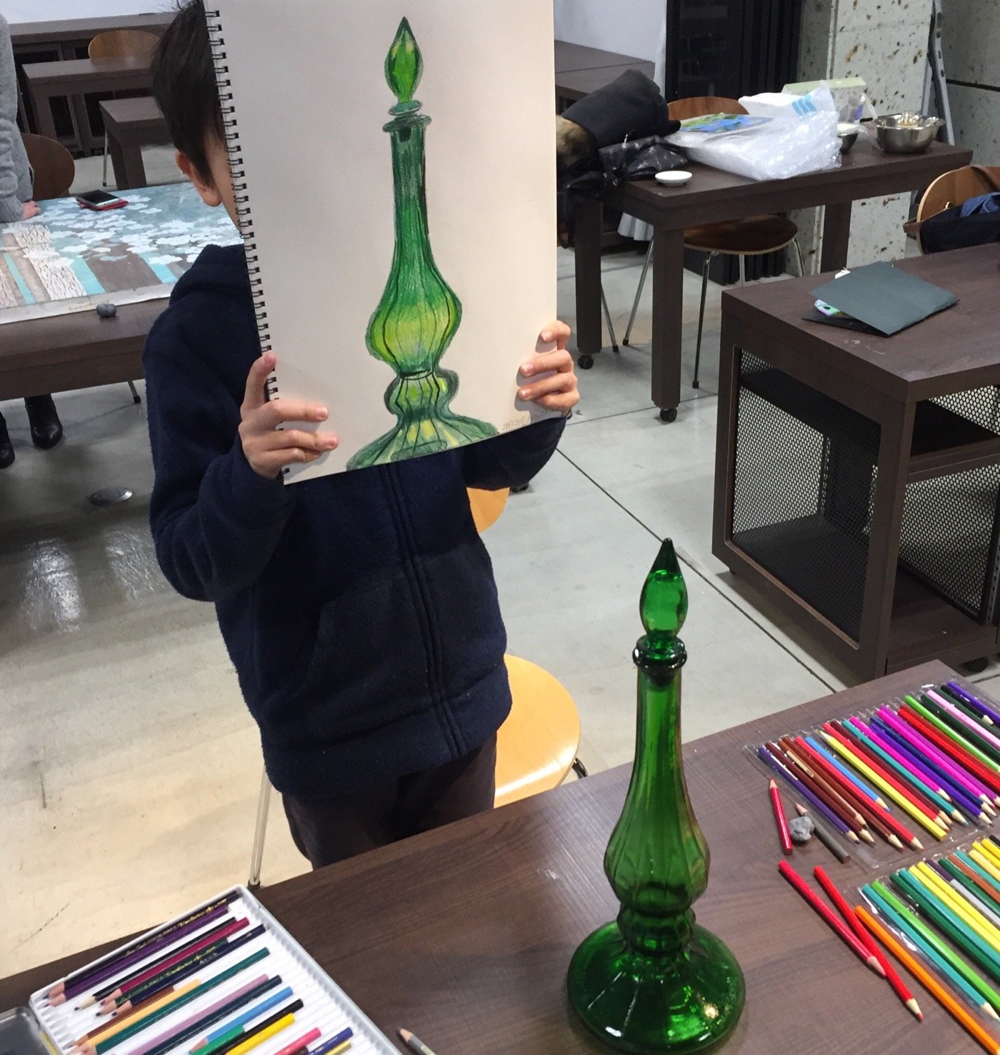 最近、ガラスや陶器などツヤツヤしたものを描き続けているD君です。