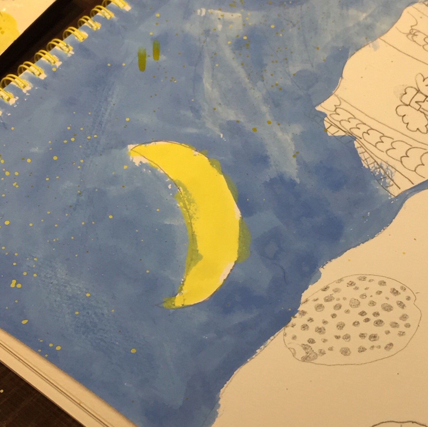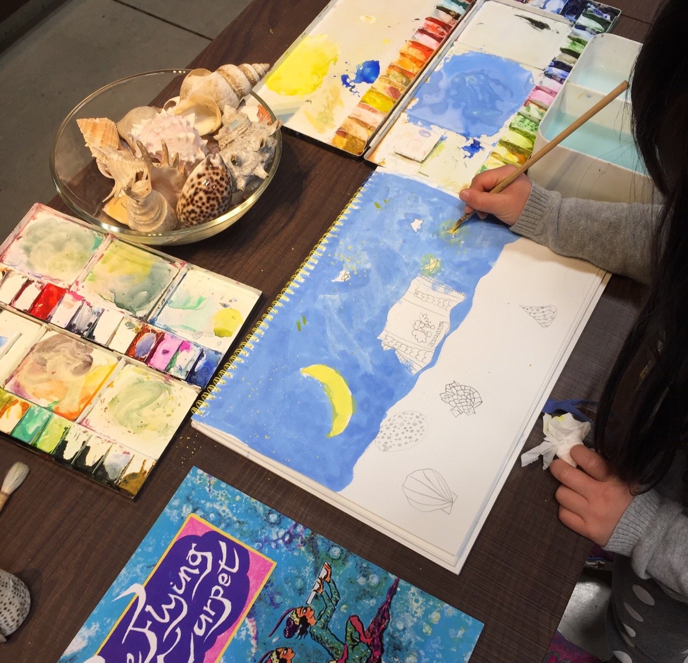 お話の中にはありませんが、貝殻が眠る夜の海の上を絨毯が飛んでいる風景を描きたいとのこと。
