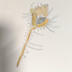 色鉛筆での作品を描き続けている小学生Dくんは、胡粉などの絵の具をすり潰す道具である「乳鉢」を描きました。