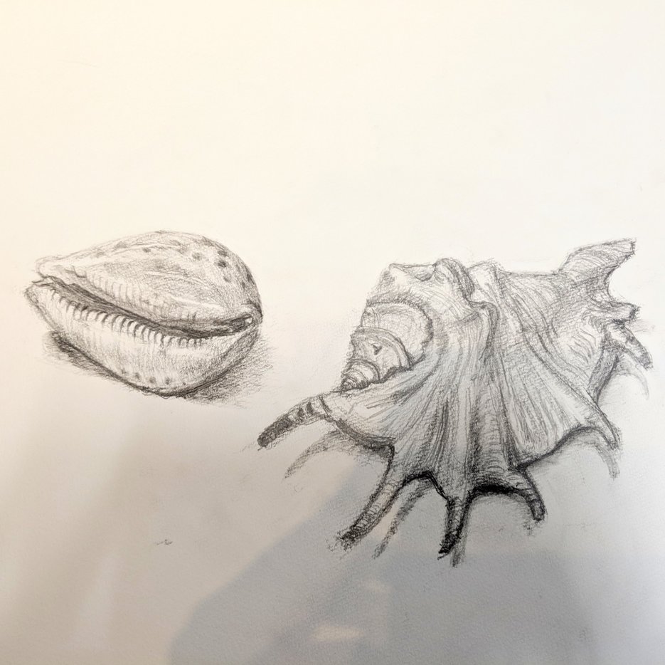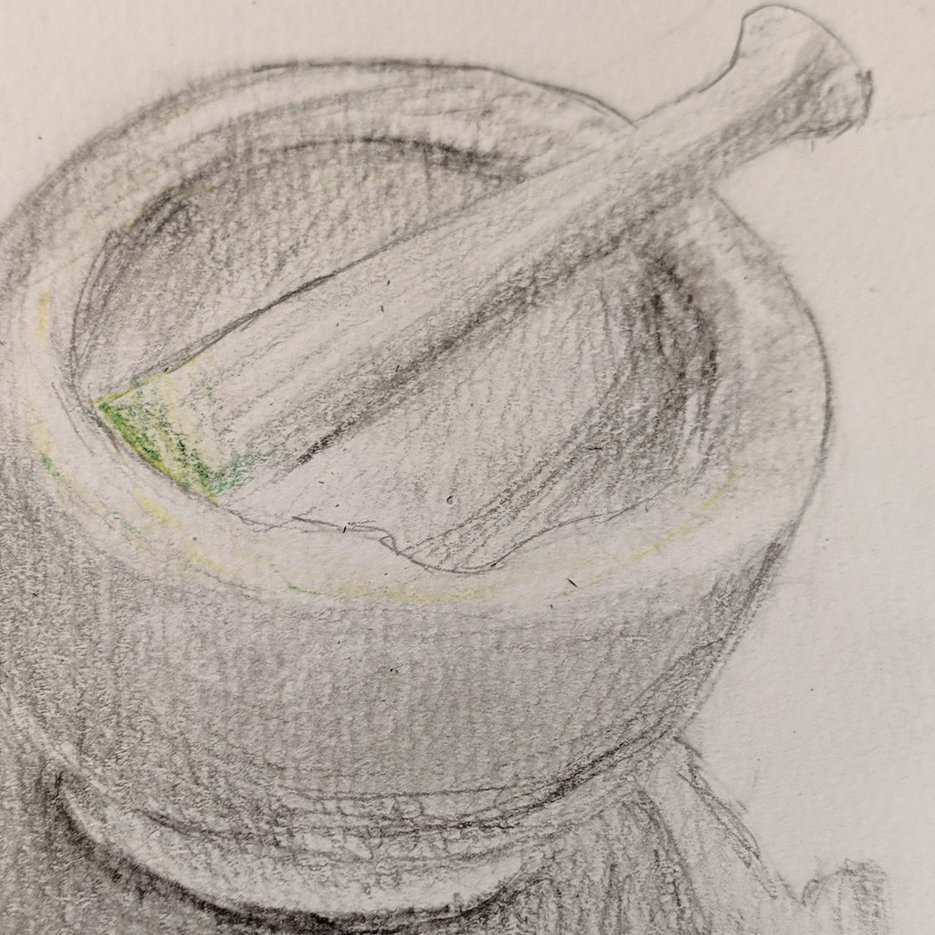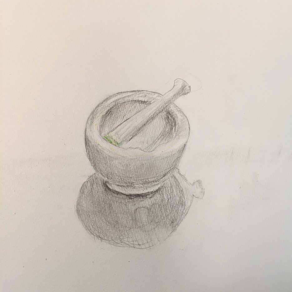 乳鉢に付いた絵の具の跡や、棒が落とす影など、、描いたりこすったり、ねりゴムで取ったり、細かな観察が魅力的な作品ですね(^^)