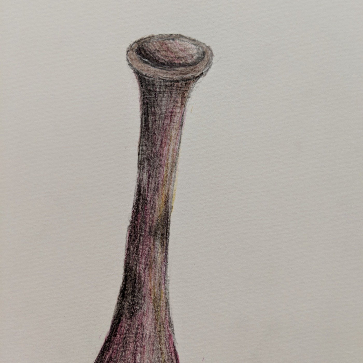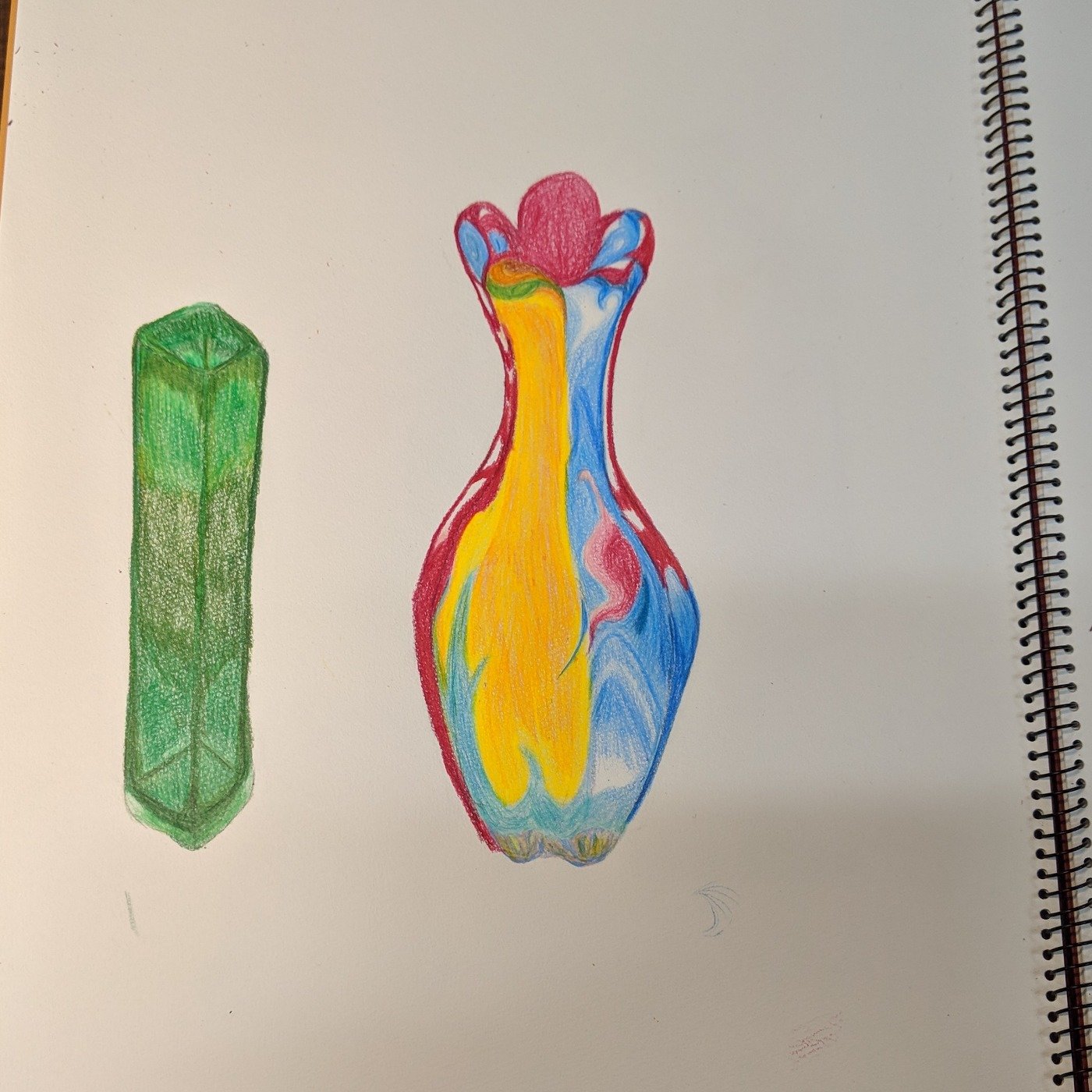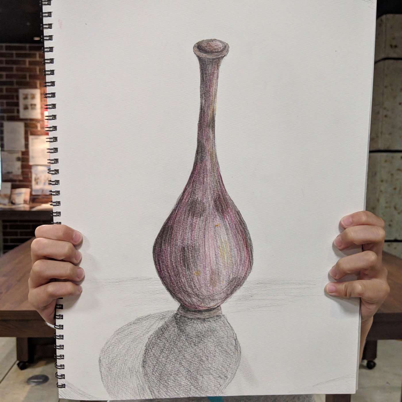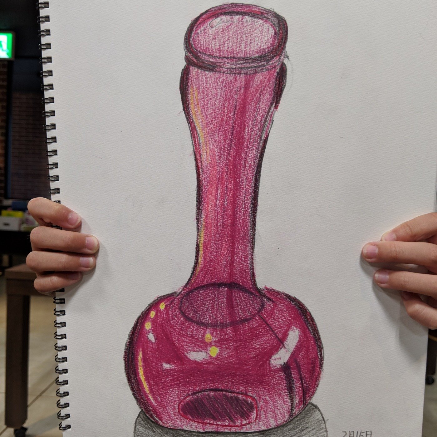上の作品は小学生Dくんが金属でできた花器を描いた作品です。そして下の赤い花瓶の作品は以前制作した作品です。