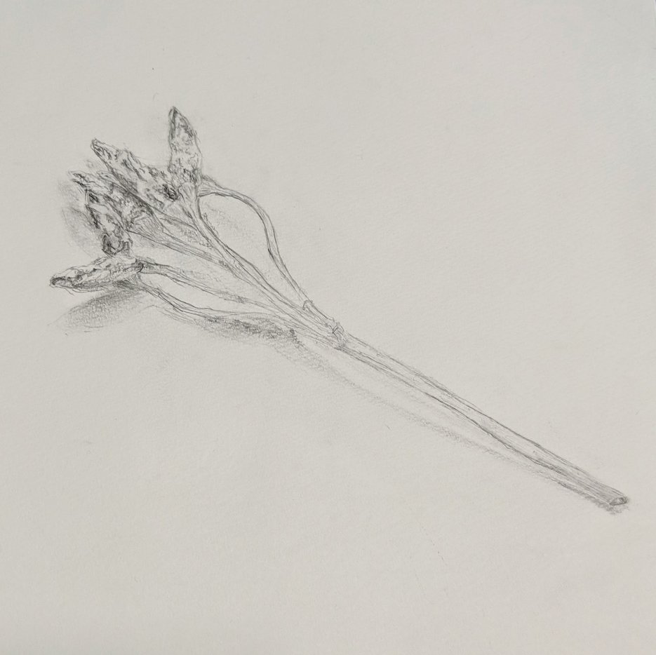 乾燥した唐辛子のデッサンをしました。実と茎の色味や質感の違いを、鉛筆を使い分けながら丁寧に描かれています。