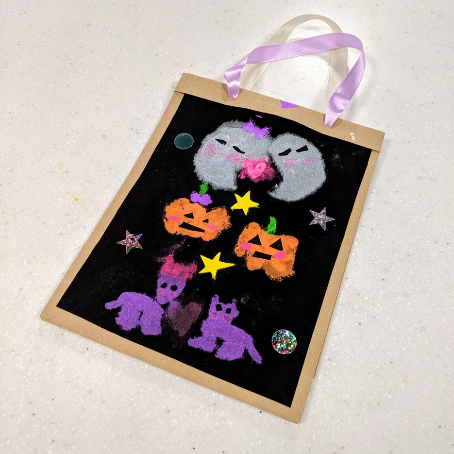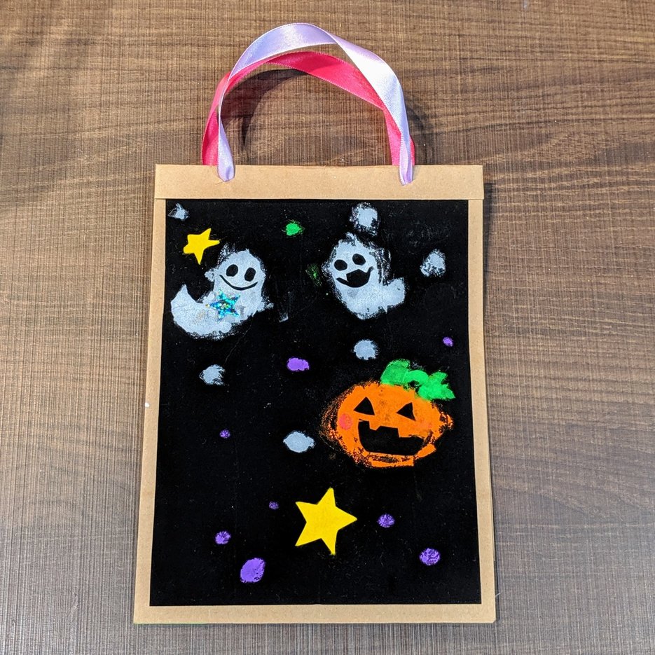 今回は紙の代わりにベロア素材のシートに絵の具でジャッコランタンやお化けを描きました。仕上げにフェルトやビーズで飾り付け。