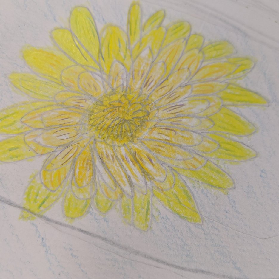 小学校のお子様の作品です。水を入れたガラス器に黄色のガーベラを浮かべて写生しました。
