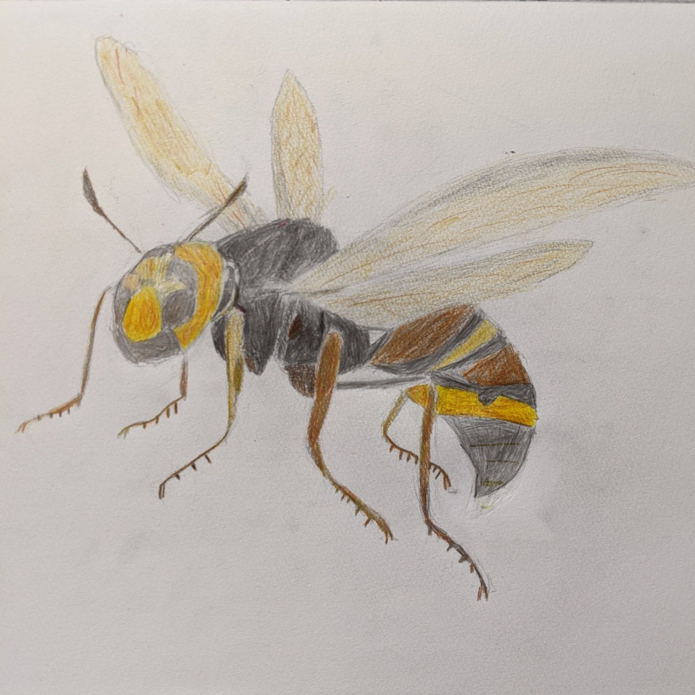 ハチの大まかな形を下書きして、色鉛筆で細かい部分を描き込んでいくと、形の大きさや位置のずれなどに気づくことがあります。