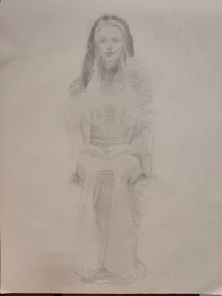 次のポーズで全身にバランス良く鉛筆を入れたいので印象的な頭部からせっせと加筆しております。
