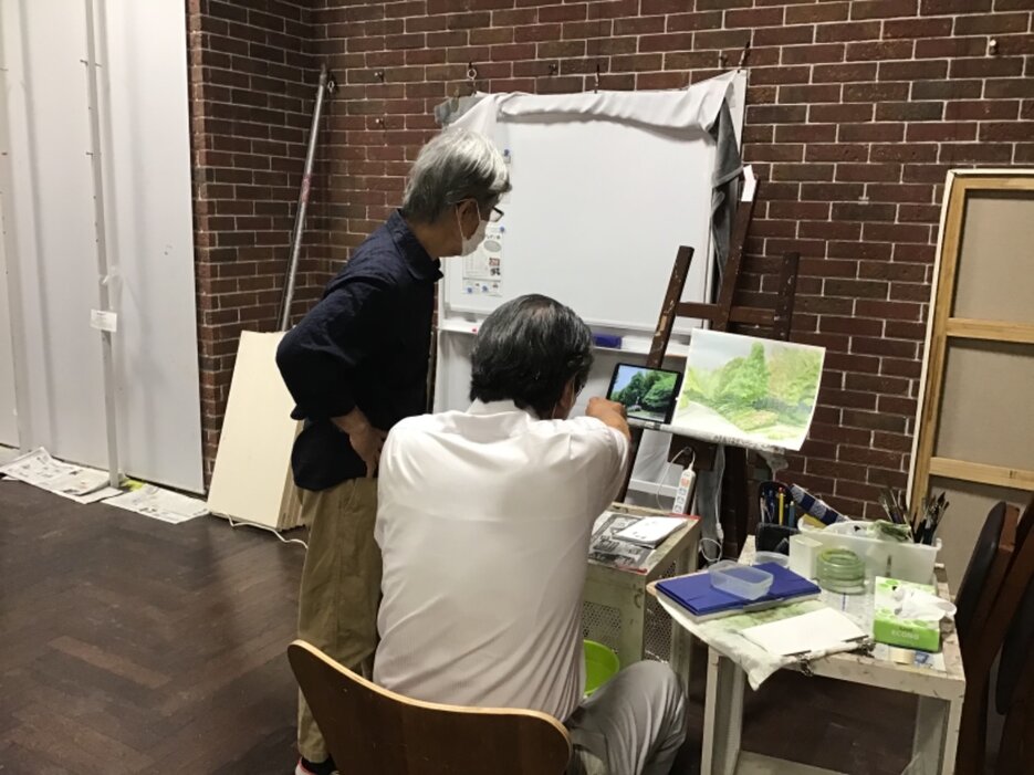 教室では、河尻さんが現地で描いた作品にアドバイスをして