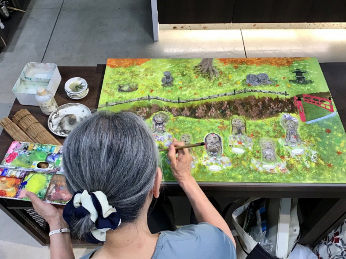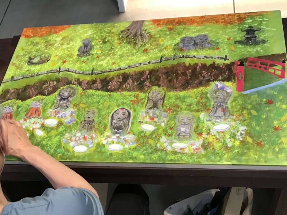 以前、京都大原「三千院」の「わらべ地蔵」をモチーフにして、「色紙」に水彩絵の具・岩絵具で描いていました。
