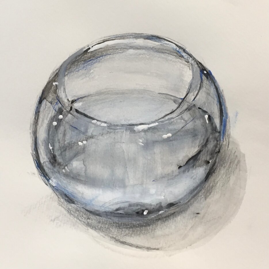鉛筆で描いたあとに絵の具を塗って仕上げています。白と黒のほかにも青色を少しだけ使っているのが深みを出していて良いですね。