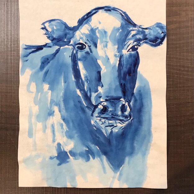 牛は写真を見ながら。牛の表情になんとも言えない味わいが出ています。