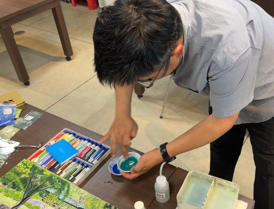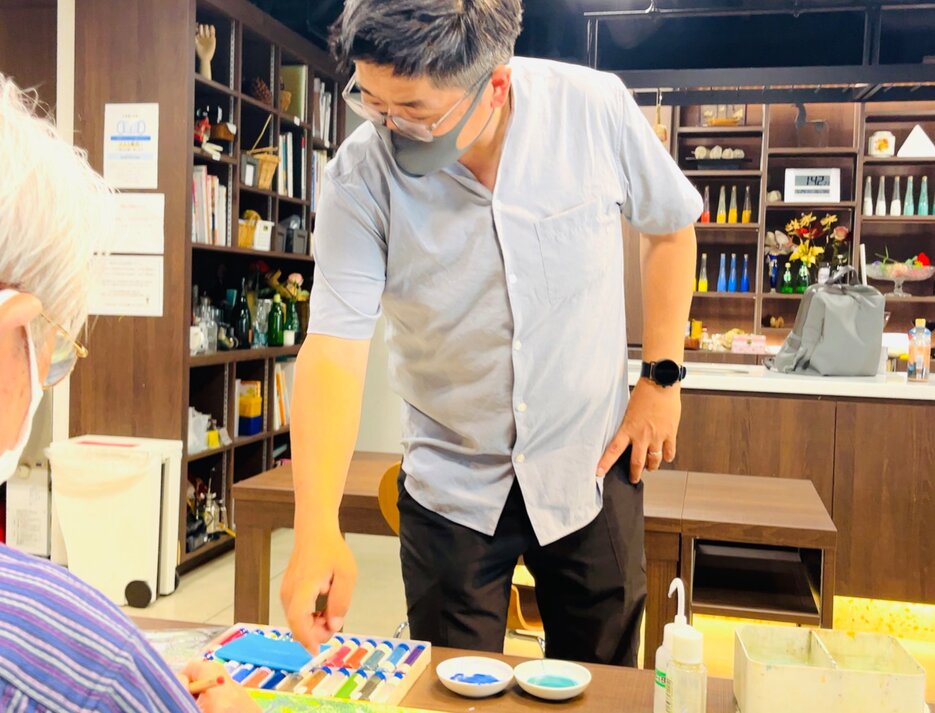 生徒さんに水干絵の具の色味を選んでいる場面です。