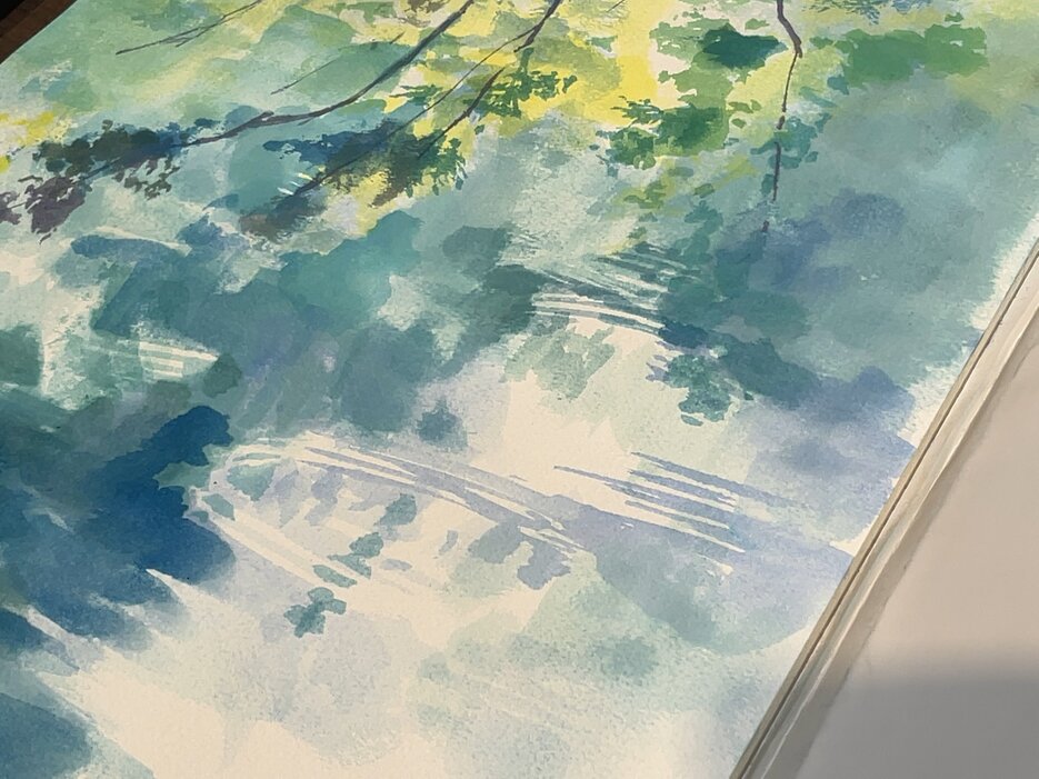 写真上・牧野環先生の水面の水彩の手本の部分写真です。