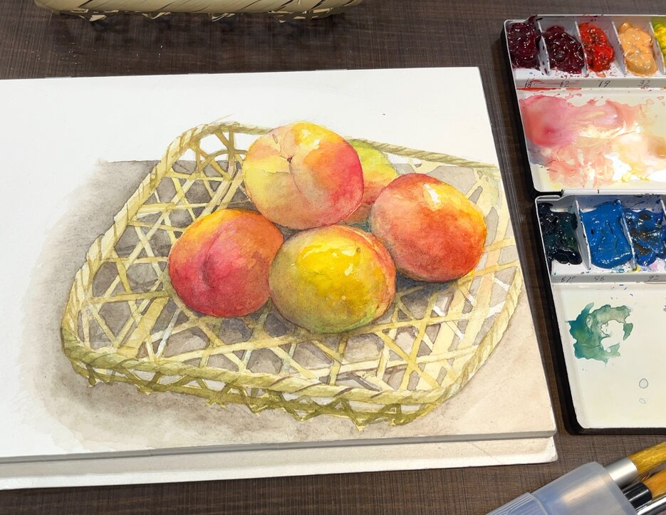 スモモの着彩です。カゴがとても緻密に描かれていますね。