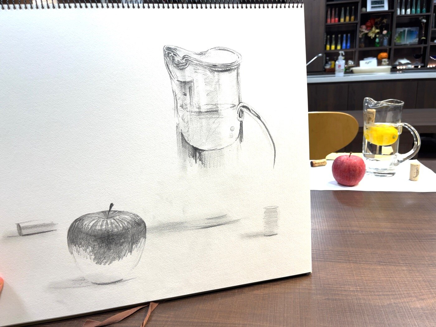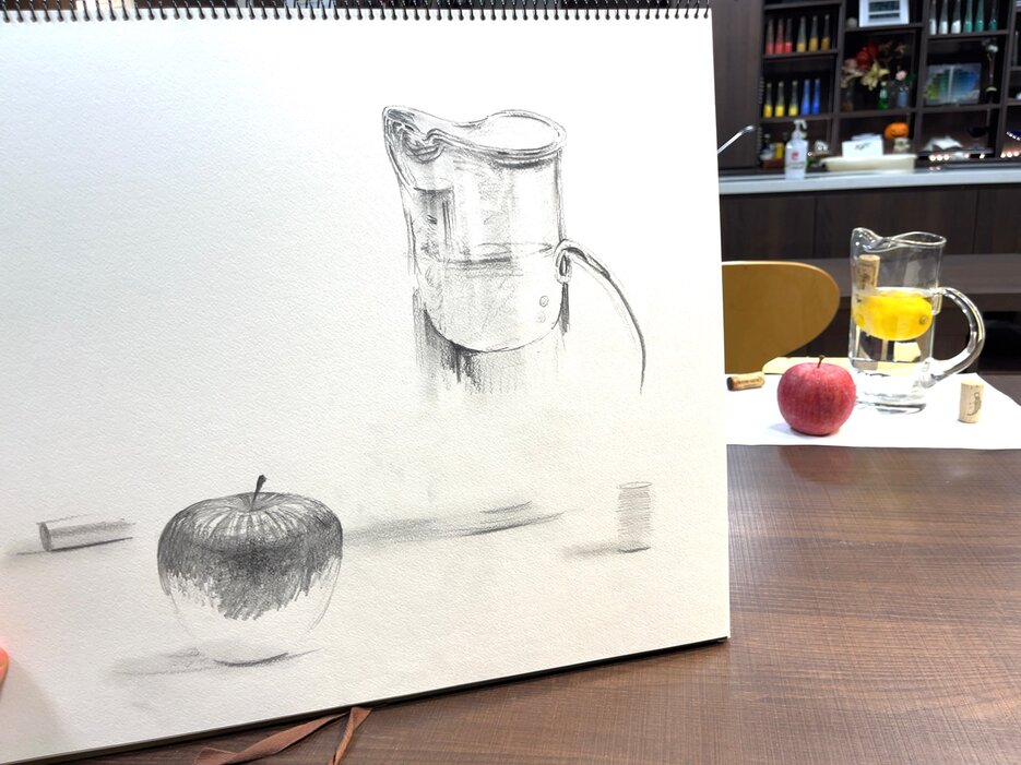写真上・本地裕輔先生の描き初めのデッサンです。生徒さんと同じモチーフでポイントを解説しながら描いてくださっています。生徒さんも本地先生の手本を参考にデッサンを勉強されています。