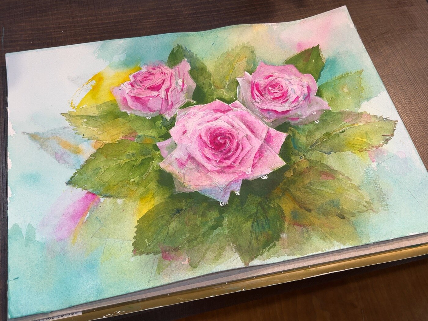 写真上・薔薇の水彩画です。日本画教室の本地裕輔先生のクラスの生徒さんです。