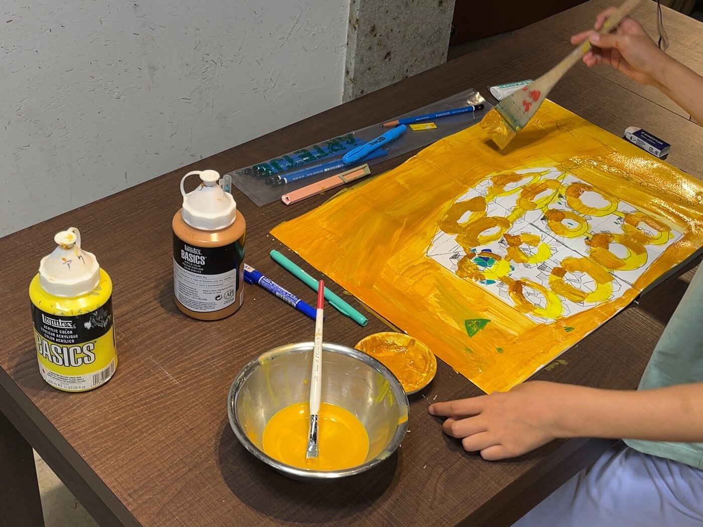 写真上・本地先生の子供教室の生徒さんです。絵の具をたっぷり使って私物のキーホルダーを描いています。