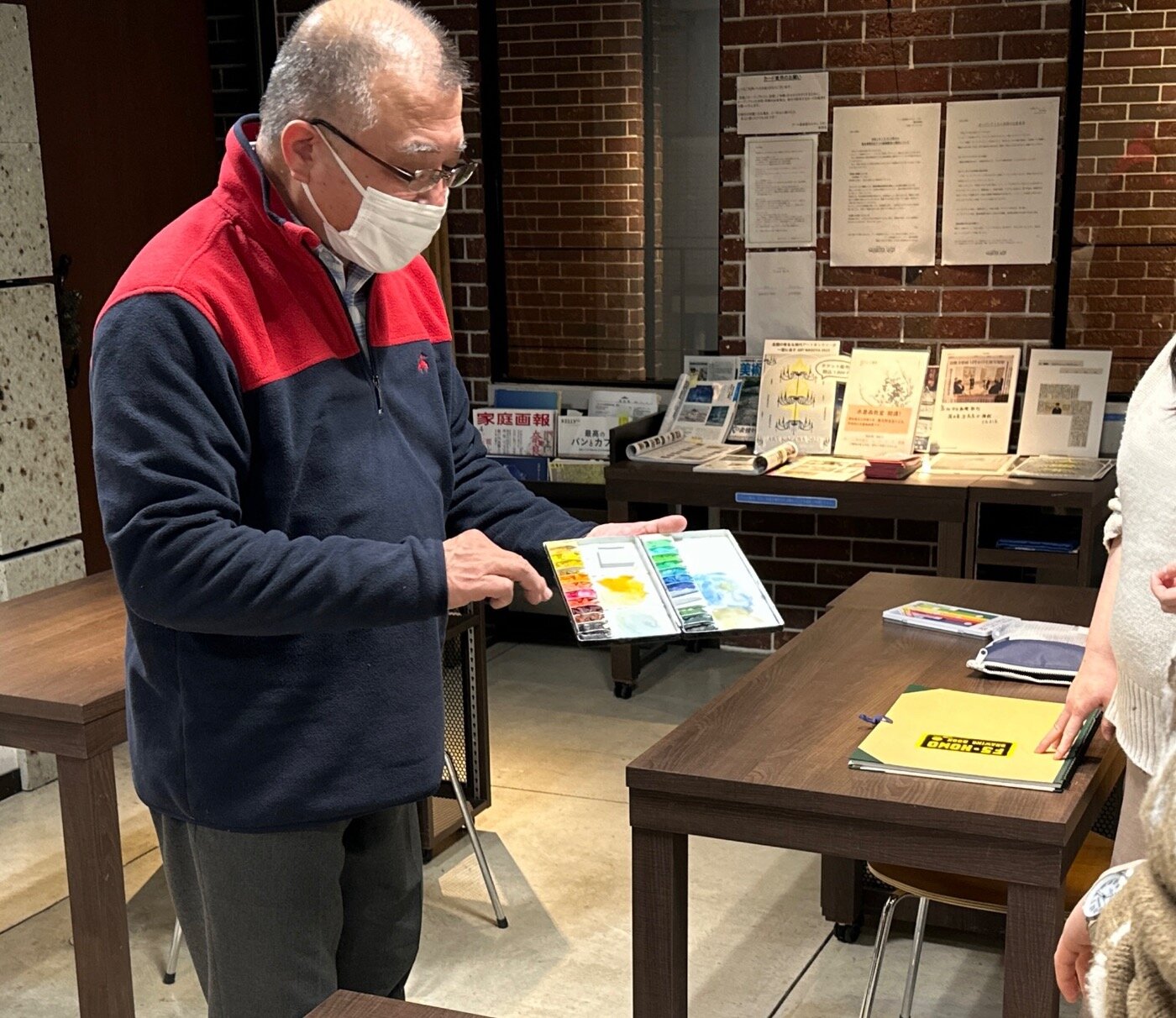 【写真上】岡田先生による水彩絵の具のレクチャーの様子です。