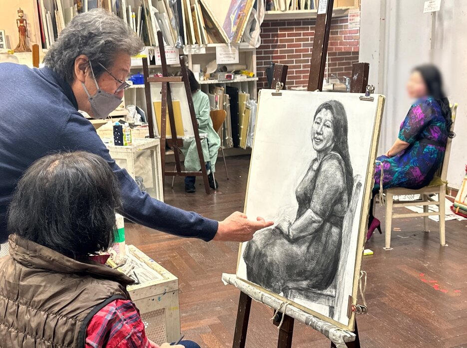 写真上は、小林雅英先生の教室での人物デッサンの様子です。
